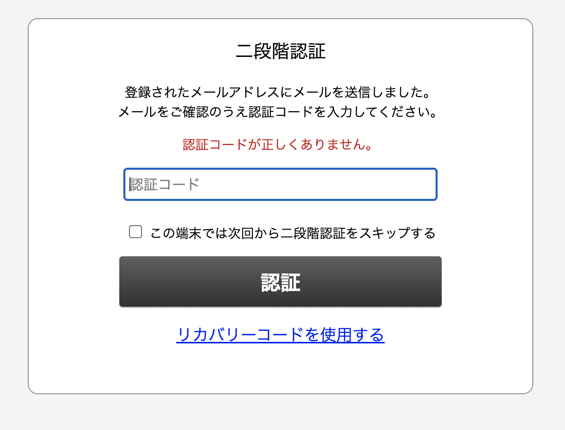 認証に失敗した場合はページ遷移せず、認証コード入力欄の上に「認証コードが正しくありません。」というエラーメッセージが表示されます。