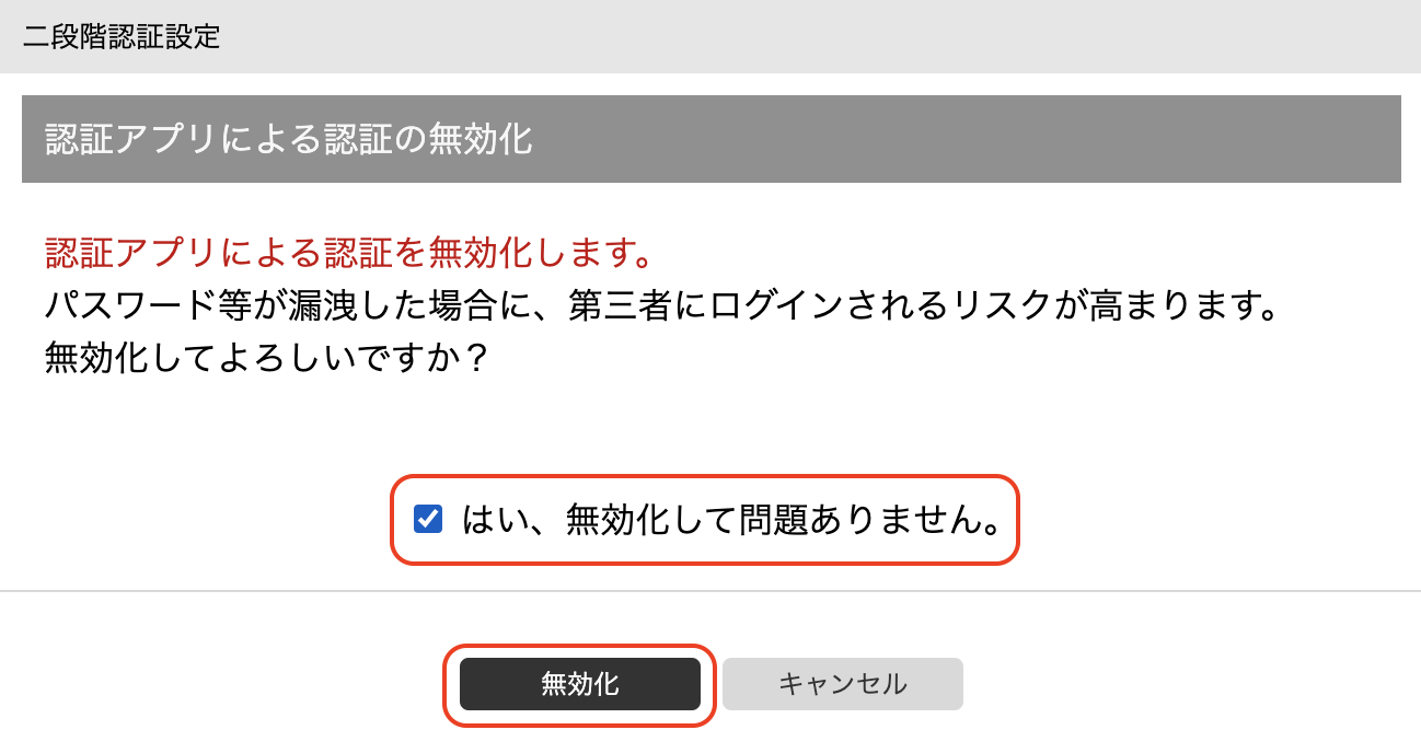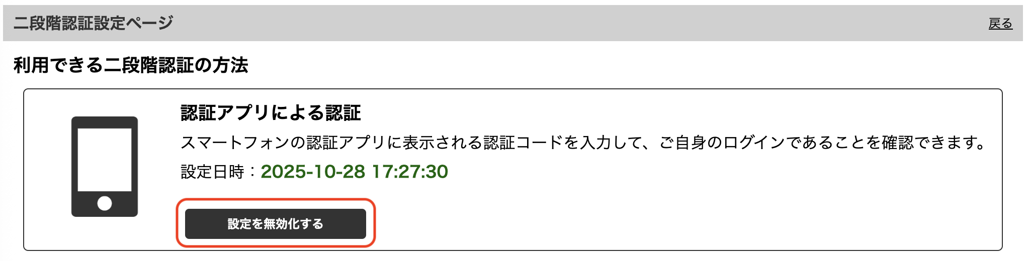 2.リカバリーコードを使用して一度ログインし、「二段階認証設定ページ」>「認証アプリによる認証」の「設定を無効化する」ボタンをクリックします。