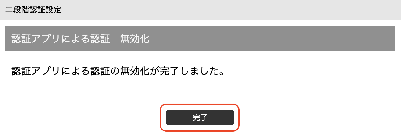 4.画面に「認証アプリによる認証の無効化が完了しました。」と表示されたら、「完了」ボタンをクリックします。