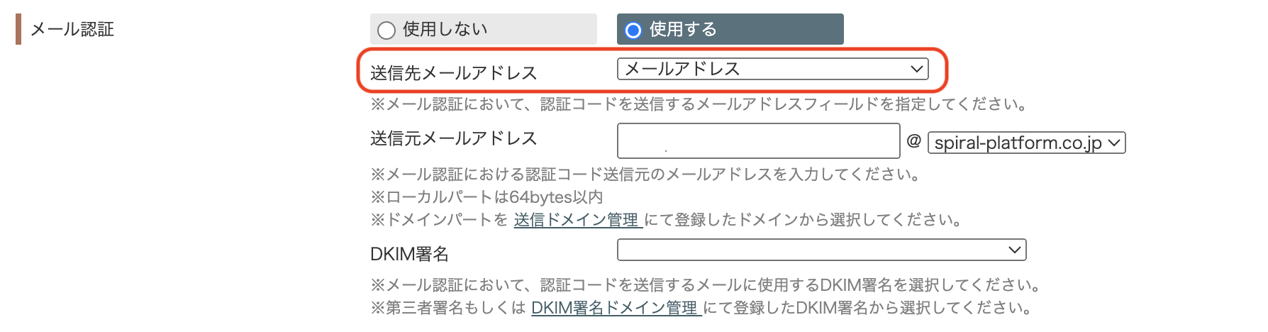 メール認証において、認証コードを送信するメールアドレスのフィールド指定は、「二段階認証方式の設定」>「メール認証」>「送信先メールアドレス」から確認できます。