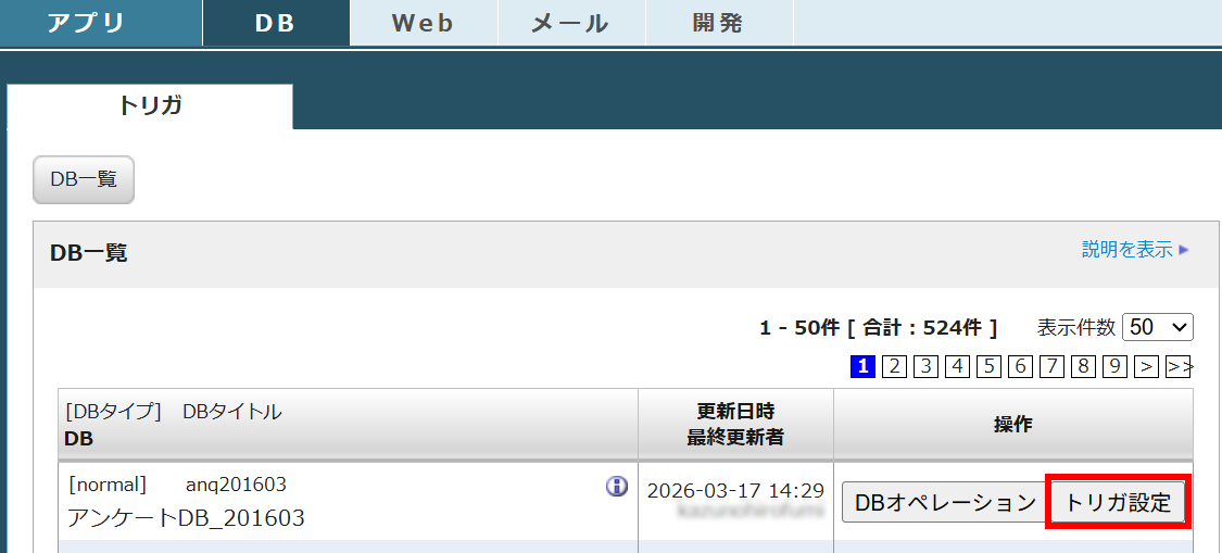 DBメニューのトリガから設定を行います。新規登録の「新規作成」から新しいトリガを設定することが可能です。