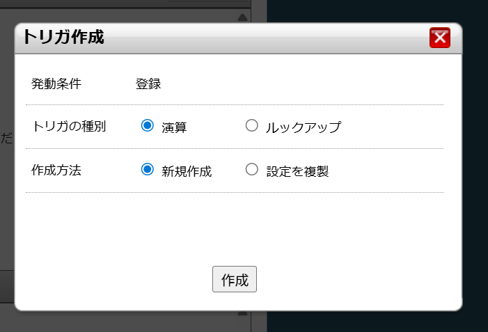 トリガ作成のメニューではトリガの種類を「演算」、作成方法を「新規作成」で作成します。