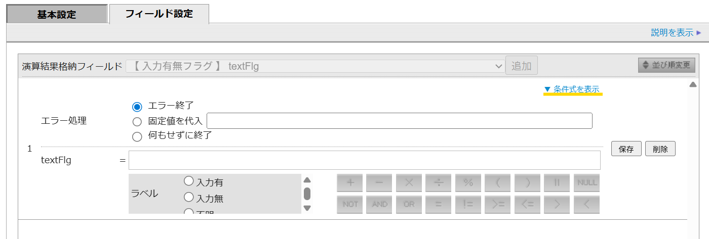 フィールド設定で「入力有無フラグ」を選択して追加し、下記画像にある「▼ 条件式を表示」をクリックしてください。