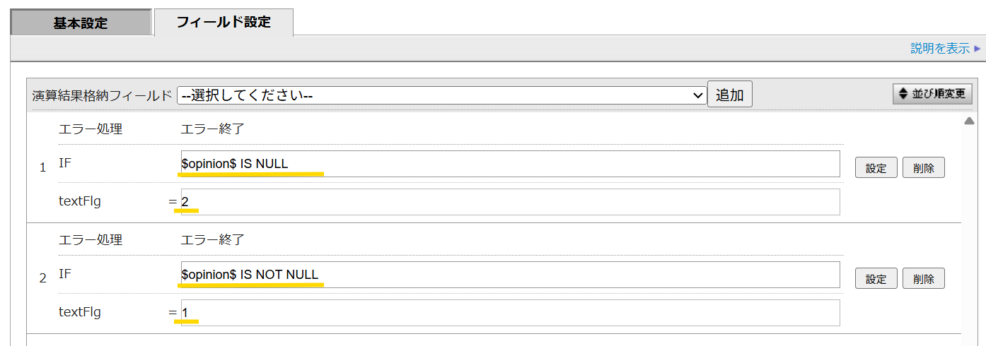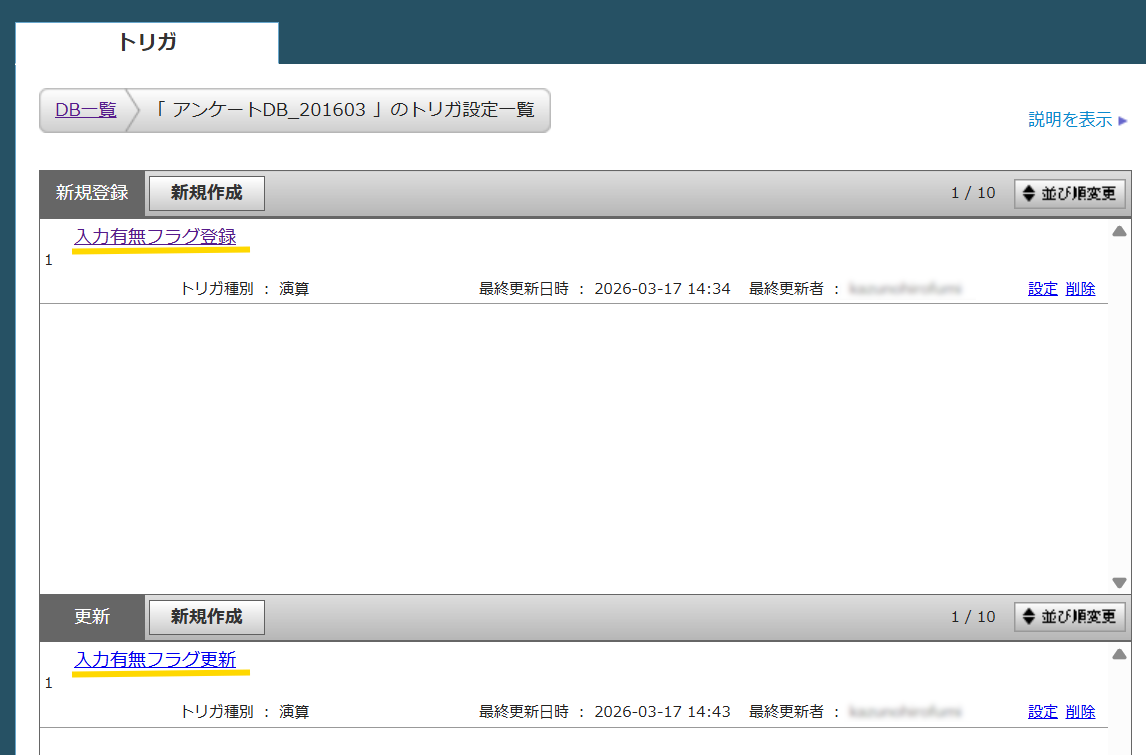 上記でデータが登録時にご意見・ご感想の値で入力有無の値が入る設定が完了しましたので、同じ作業を更新の新規登録から作業してください。