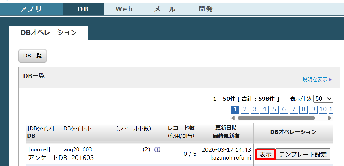 DBメニューのデータ操作(DBオペレーション)を選択し、アンケートDBの「表示」ボタンを選択。