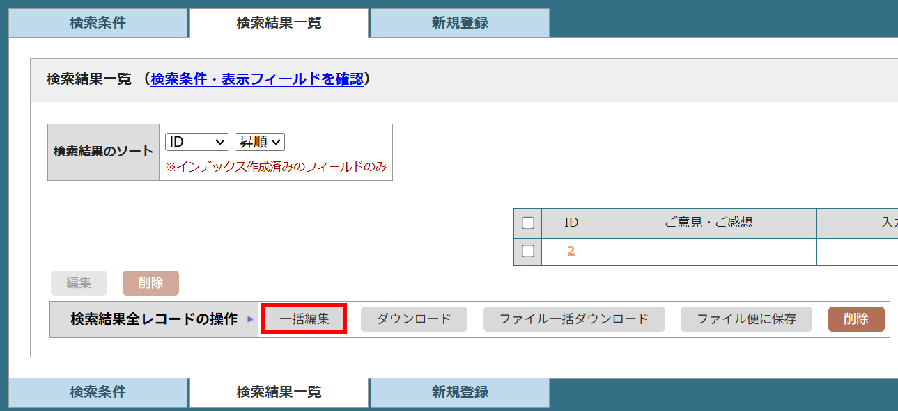 ご意見・ご感想の値がないデータが表示されますので、「検索結果全データの操作」を選択し、操作メニューを表示したら「一括編集」を選択。