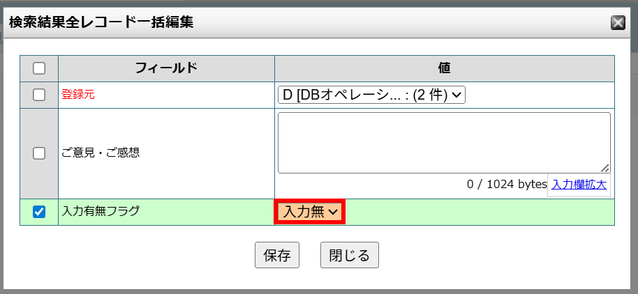 入力有無フラグで「入力無」を選択。更新するものだけチェックが付き、背景色が変わるので