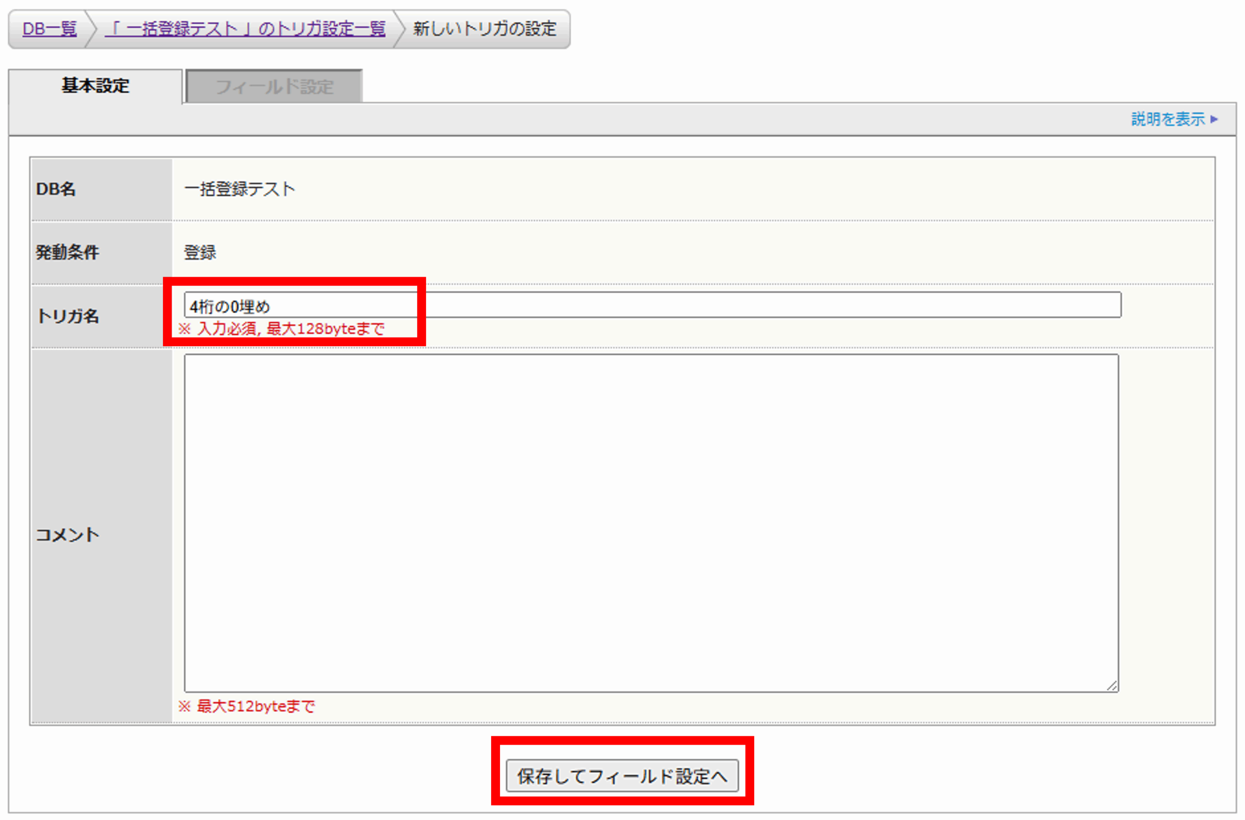 トリガ名を指定してフィールド設定へ進みます。