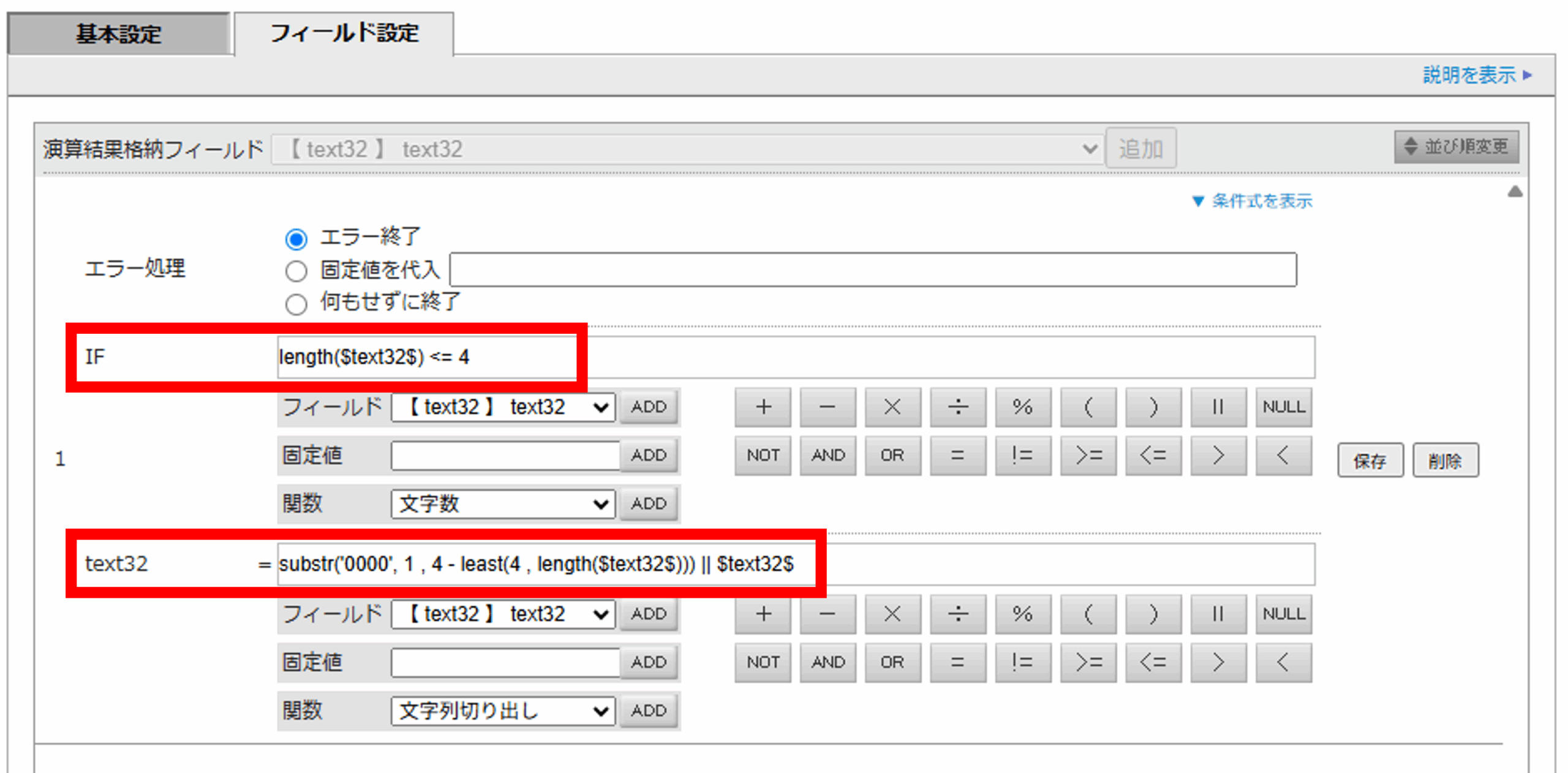 3.「1」にて追加した演算結果格納フィールドに対し、下記のように設定し保存します。