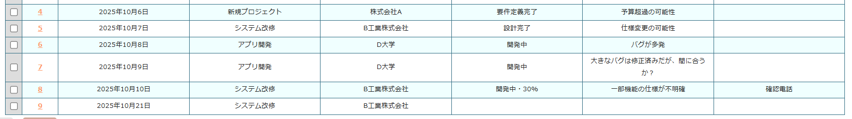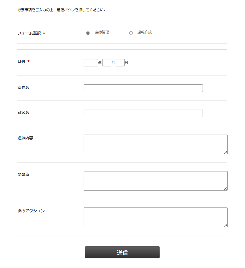 $report_data_string = ""; $field_map = [ "f00xxxxx" => "日付", "f00xxxxx" => "案件名", "f00xxxxx" => "顧客名", "f00xxxxx" => "進捗内容", "f00xxxxx" => "問題点", "f00xxxxx" => "次のアクション" ];