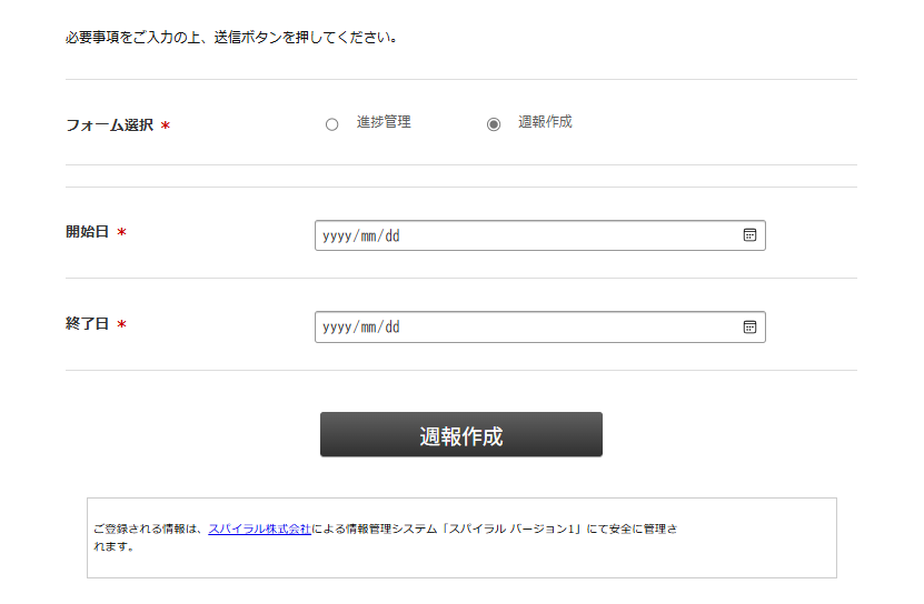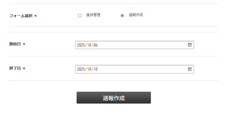 「週報作成」を選択した場合のフォームには、「開始日」と「終了日」を入力できるようにソースコードを追加します。