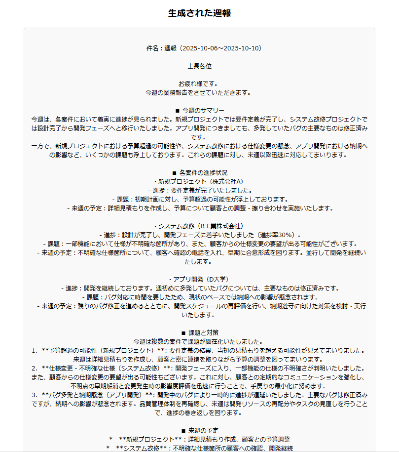 $prompt = "あなたは優秀なアシスタントです。\n" . "以下の業務報告データを元に、上司に提出するための丁寧な言葉遣いの週報を作成してください。\n\n" . "フォーマットは以下のように、見やすくおねがいします。\n" . "件名:週報({$start_date}~{$end_date})\n\n" . "■ 今週のサマリー\n(全体の状況を簡潔にまとめてください)\n\n" . "■ 各案件の進捗状況\n・[案件名]\n - 進捗:[進捗内容を記載]\n - 課題:[問題点を記載]\n - 来週の予定:[次のアクションを記載]\n\n" . "■ 課題と対策\n(全体を通しての課題や、特筆すべき問題点とその対策をまとめてください)\n\n" . "■ 来週の予定\n(全体の来週の予定をまとめてください)\n\n" . "---\n元データ:\n{$report_data_string}";