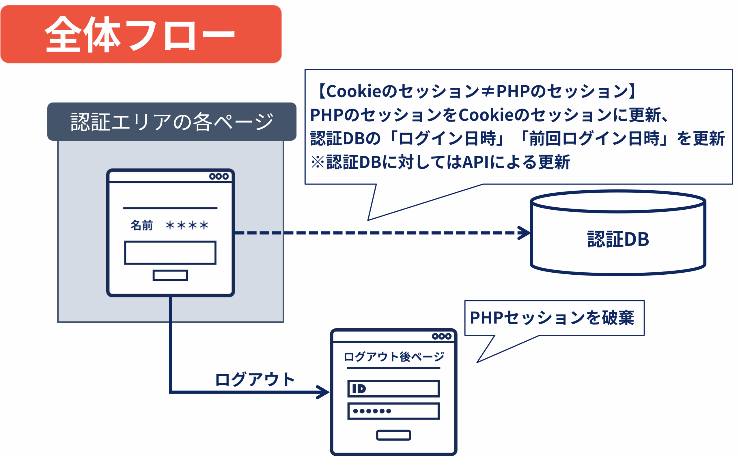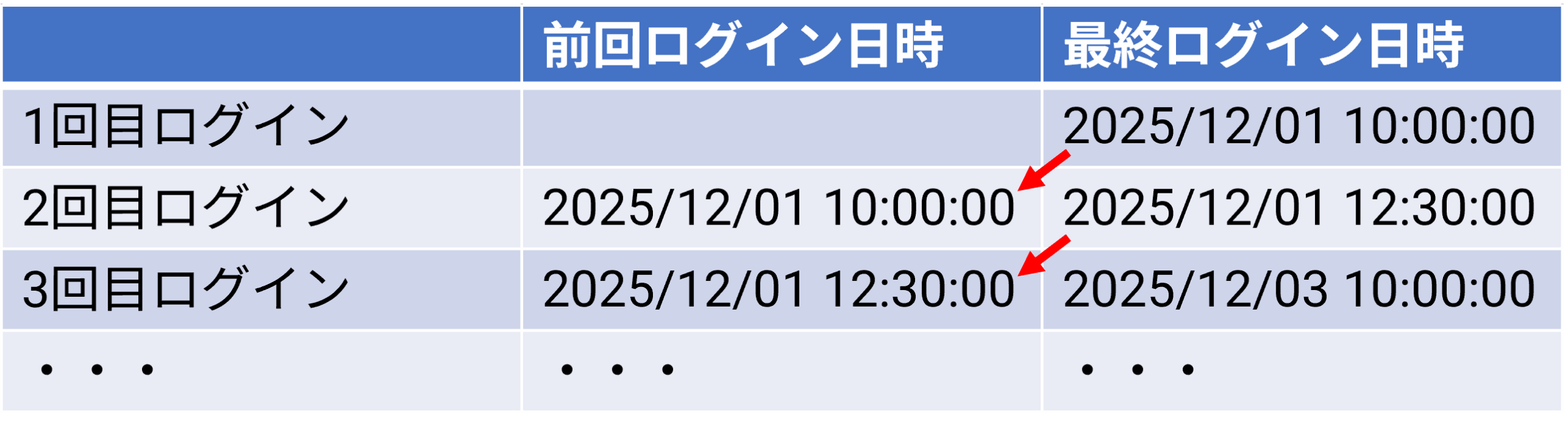 比較をすることで「新規ログイン」または「ログイン状態」かを判断し、「新規ログイン」の際に認証DBに「最終ログイン日時」「前回ログイン日時」を更新する処理を行います。