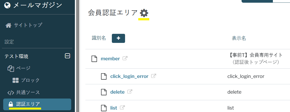 その認証エリアに設置するページのURLはページ識別名の前に認証エリア識別名が追加されます。