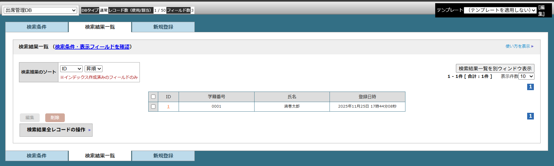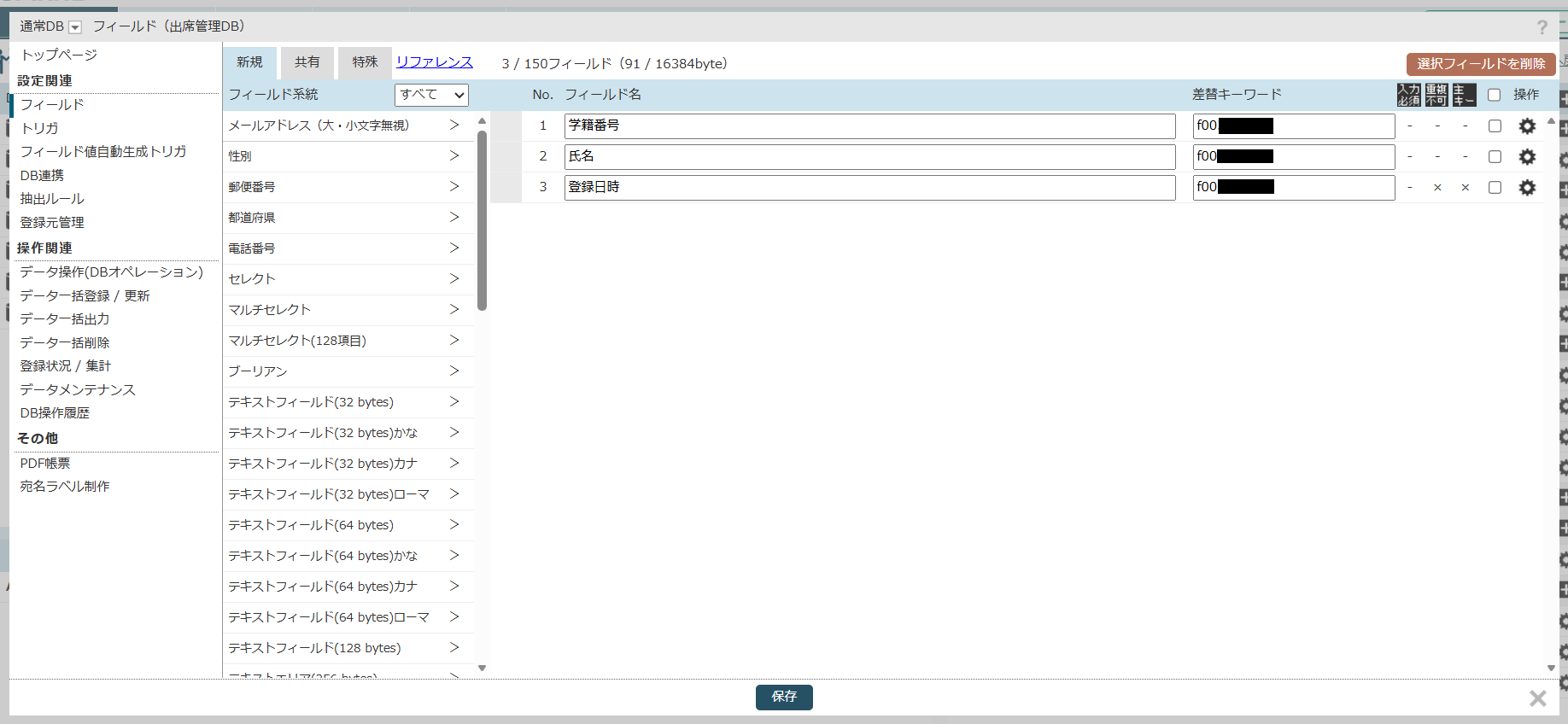 今回は授業の出席管理が目的なので「学籍番号」「氏名」「登録日時」フィールドを使用します。
