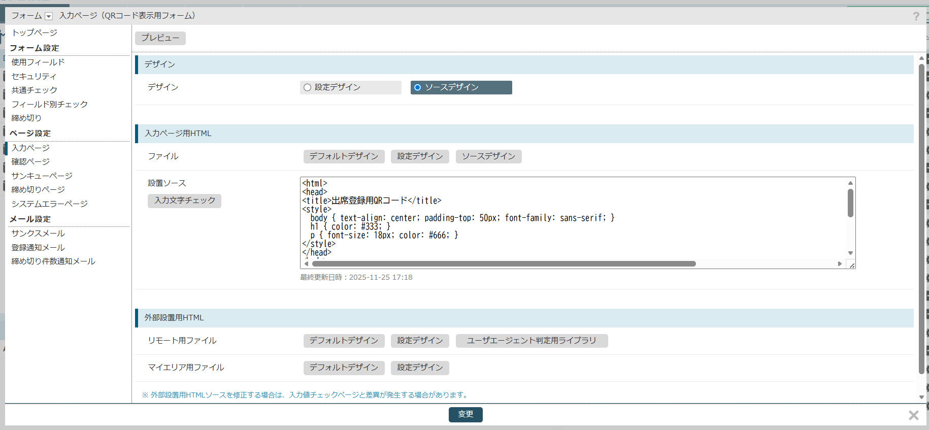 変更は入力ページのデザインを「ソースデザイン」に設定して行ってください。