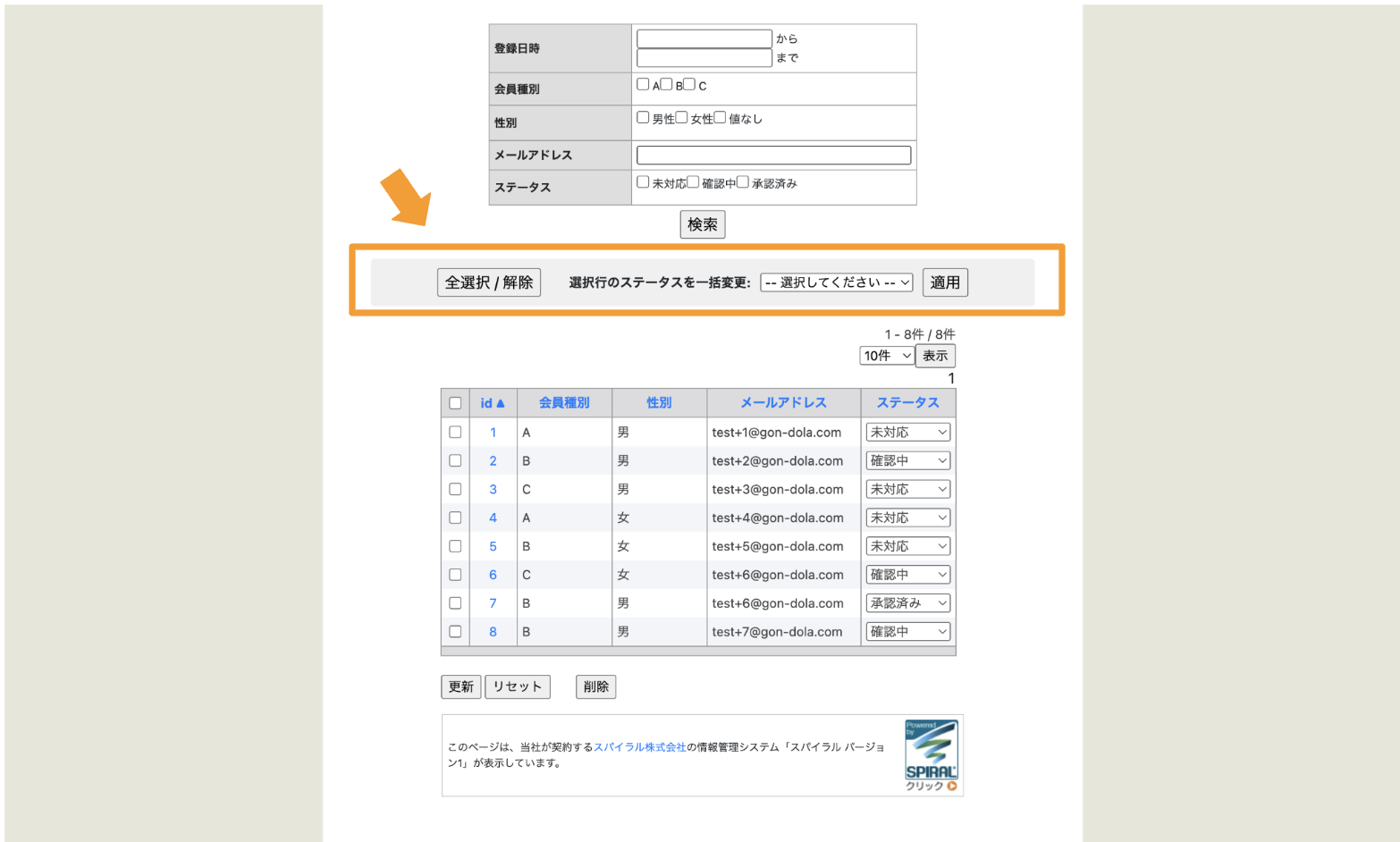 上記デモサイトでは、チェックボックスが選択された行のステータスをまとめて更新します。