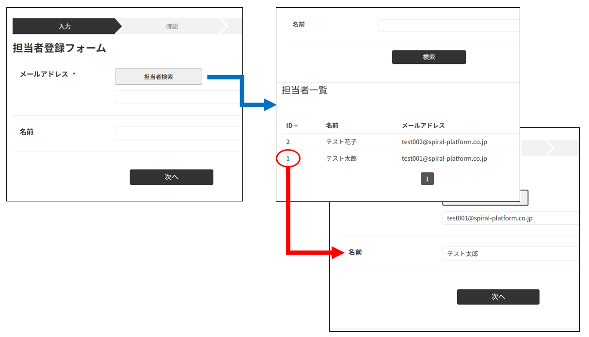 このソースによって、ボタンをクリックすると担当者の一覧が表示され、一覧から名前をクリックすると自動でフォームに反映すると言ったことが可能になります。