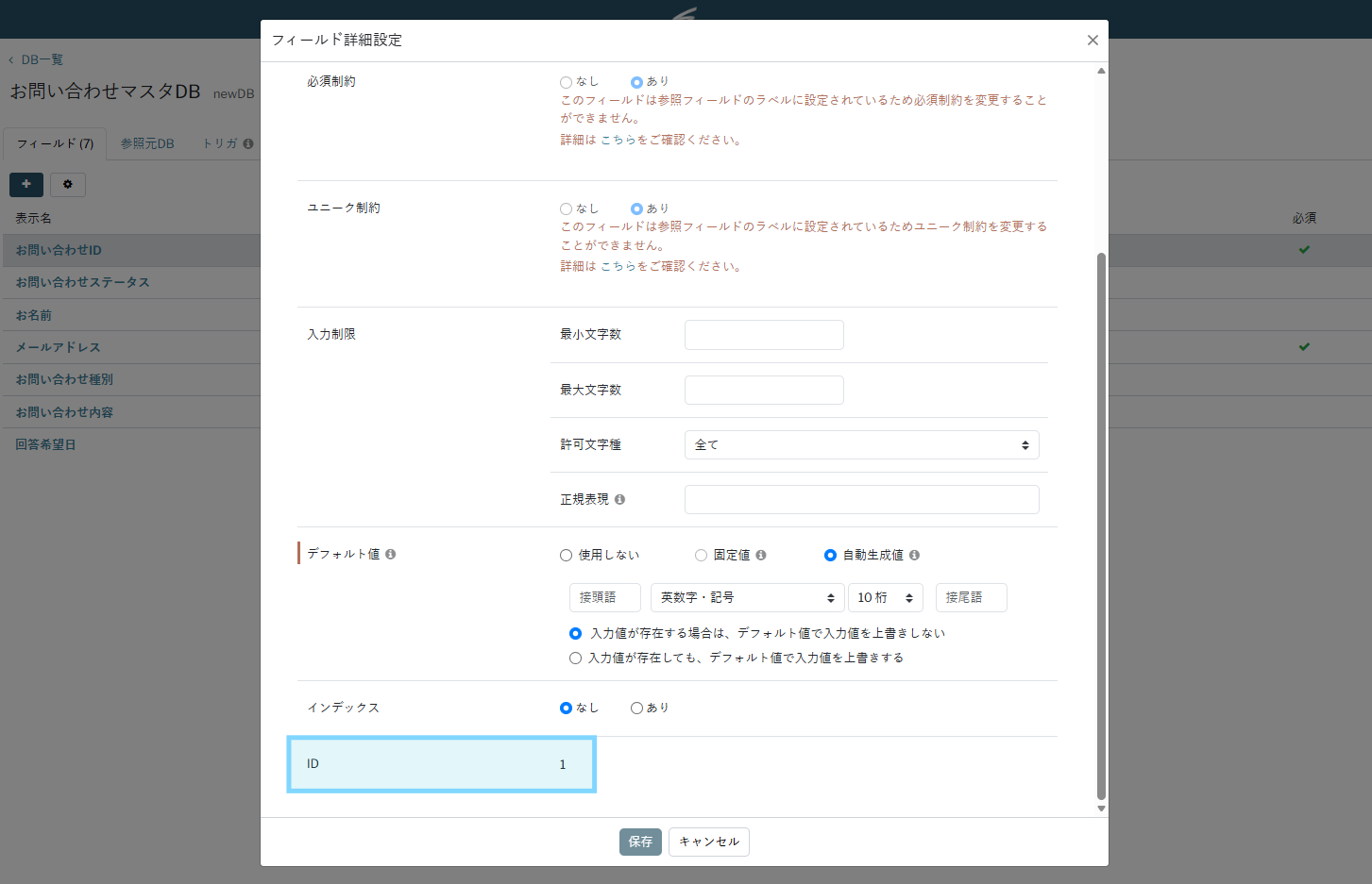 以下の2つのフィールドを自動登録で設定します。お問い合わせマスタDB から お問い合わせコメントDB へ引き渡すための設定です。