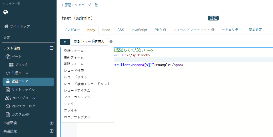ご連絡いただきましてありがとうございます。 > (a)URLの末尾の値 > (b)ログイン者の「adminの参照フィールド:group」 > を比較する必要があると認識しています。 大変申し訳ございません。 (a)URLの末尾の値が取得できていないと読み間違えておりました。 質問と異なる回答となり申し訳ございません。 > getParamで取得できるのは、(b)ですか? > 「(a)URLの末尾の値」と比較することで、改ざんを防げますか? getParamで取得できるのは、(a)の値となります。 (b)ログイン者の「adminの参照フィールド:group」は、 ページのソース設定の「body」から「認証レコード値挿入」を行うことで取得可能です。 下記手順で、認証レコード値を挿入することが可能です。 1. 登録フォームのあるページをソース設定に変更 2. bodyの「認証レコード値挿入」より、参照フィールドをクリック 3. 参照フィールドの項目が表示されるので、「ID」を選択 上記手順で、ログイン者の「adminの参照フィールド:group」のIDが取得できますので、 (a)URLの末尾の値と比較することが可能です。 比較する際には、「認証レコード値挿入」にて挿入したコードを変更する必要がございます。 下記に、(a)と(b)が一致の場合に登録ブロックを表示、 不一致の場合にはフリーコンテンツブロックを表示を行うコードを記載いたしますので ご参照いただけますと幸いです。 ※(a)、(b)で取得している値は、「DB:group」の参照しているレコードIDとなります。 ※フリーコンテンツを表示する場合には、「権限なし」などの文言を設定していただき、登録できない旨の記載を行うこと等が可能です。 何卒よろしくお願いいたします。