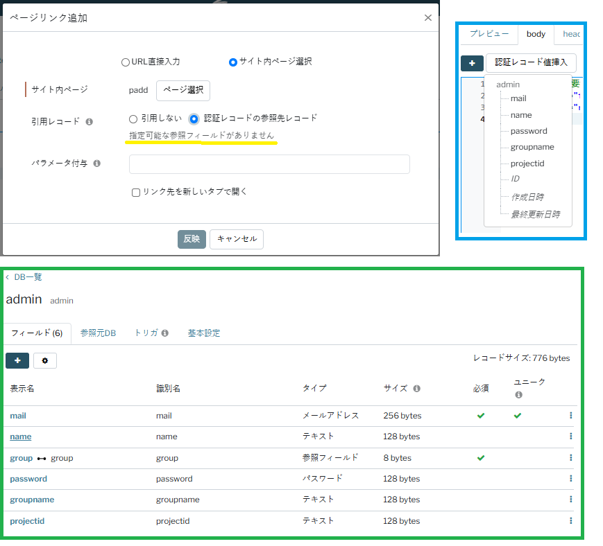 ご回答ありがとうございます。 >登録フォームの自動登録で、「projectの参照フィールド:group」の値に >「adminの参照フィールド:group」と同じ値を登録したいということで認識相違ございませんでしょうか。 相違ございません。 >1. 認証エリア「admin」のページから登録フォーム「「padd」(project追加)」へ遷移するリンクに > 「引用レコード:認証レコードの参照先レコード」にて「group」を選択いただく リンクにて、「引用レコード:認証レコードの参照先レコード」という設定方法が見つかりません。 どの様に設定できますか? 下の2つの設定とは異なると想像しています。 (以下、異なると思われる設定、2ヶ所) 「フリーコンテンツ(ビジュアル設定)→ページリンク追加→パラメータ付与」 を見ると、追加できるのは、固定のパラメータのみに見えました。 「フリーコンテンツ(ソース設定)→認証レコード値→フィールド」 を見ると、「group(参照フィールド)」が選択肢にあらわれません。